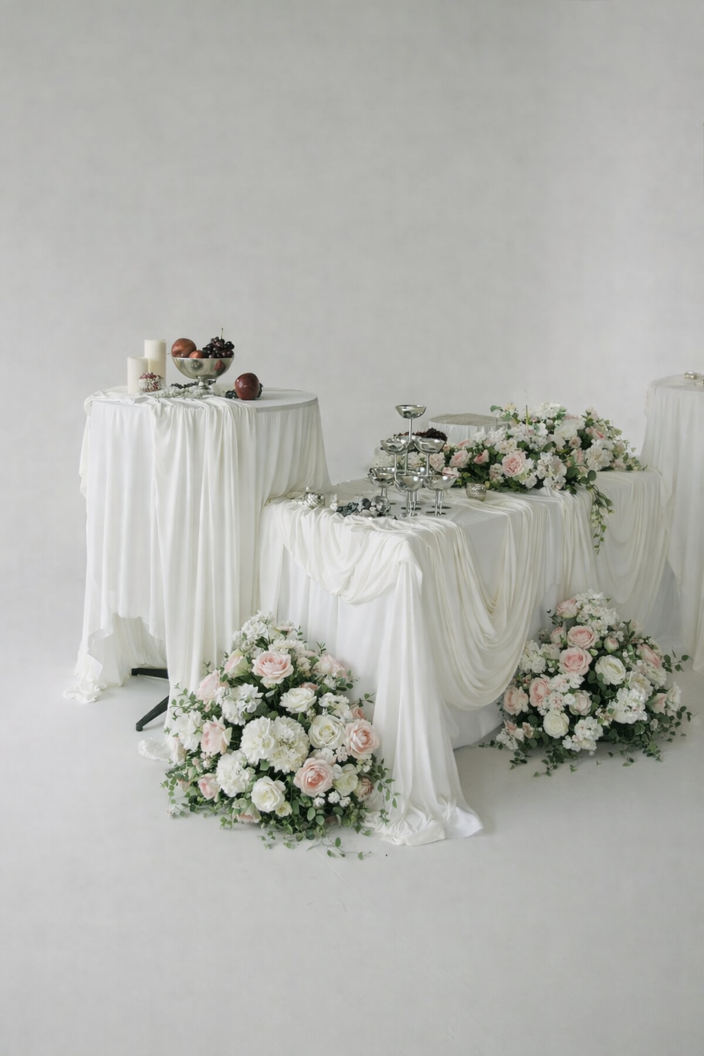 Draping is available in a curated selection of colors, including ivory, white, blush, burgundy, and other tones depending on availability. Fabric selections are chosen to complement your overall event design.
